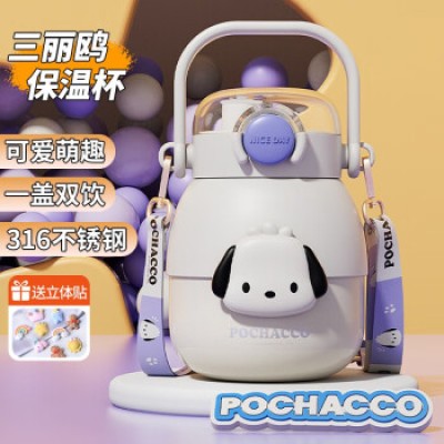 Muting Double Drink Big Belly Warm Cup for Children, Women, and Students High Beauty Straw Water Cup with Large Capacity 316 Stainless Steel Cup Pot, Pacha Dog -880ML